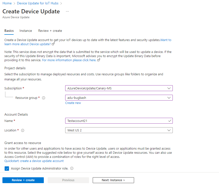 - Subscription: The Azure subscription to be associated with your Device Update account.