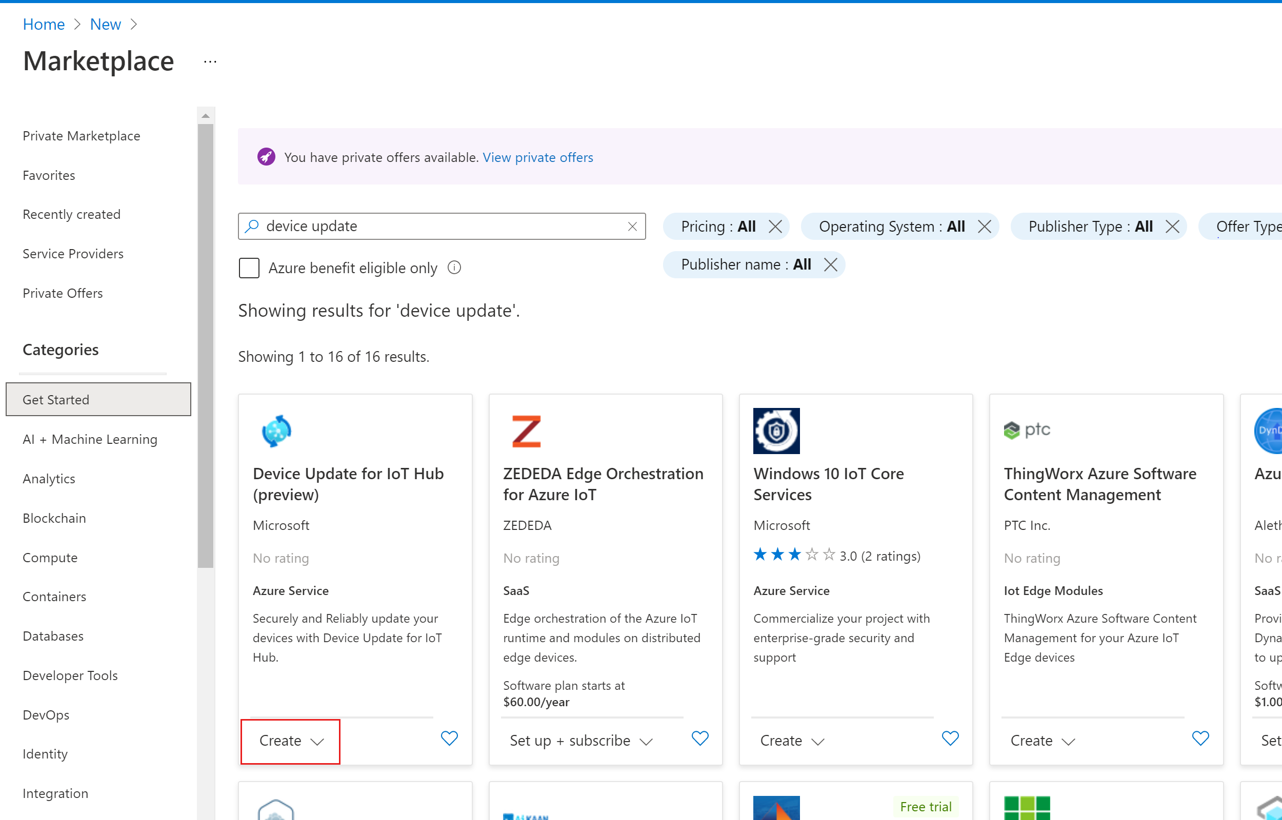 In the Azure portal, select Create a Resource and search for "Device Update for IoT Hub"