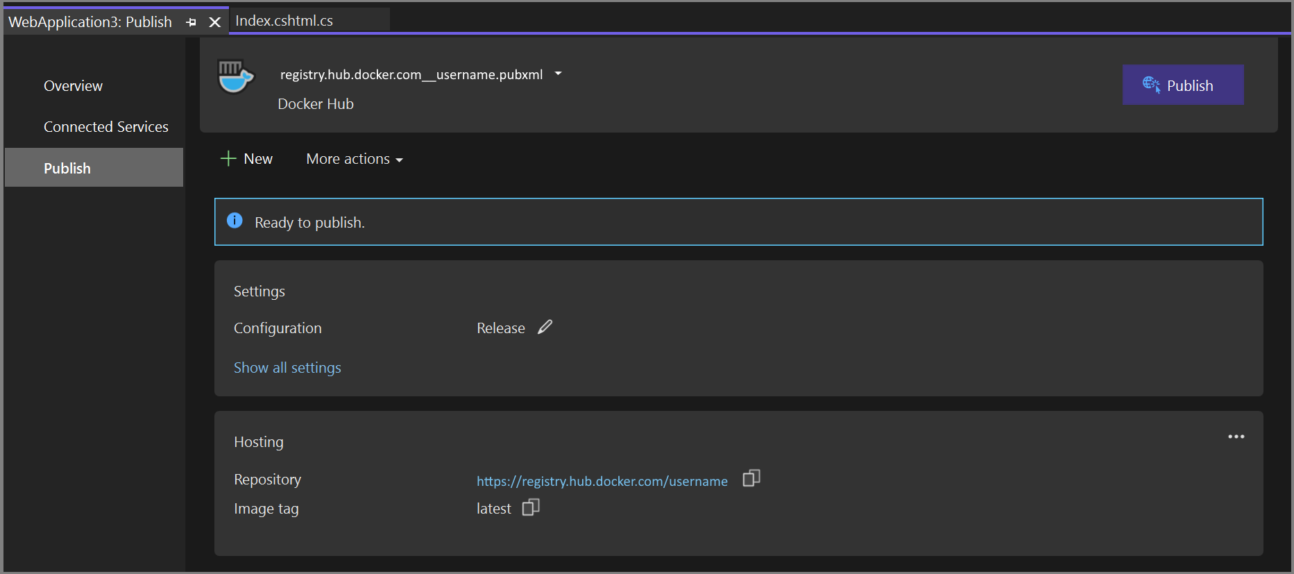 Visual Studio attempts to deploy your image to the Docker Hub. If successful, the Publish screen appears with the URL for the repository image, the image tag, repository, and the build configuration (for example, Release).