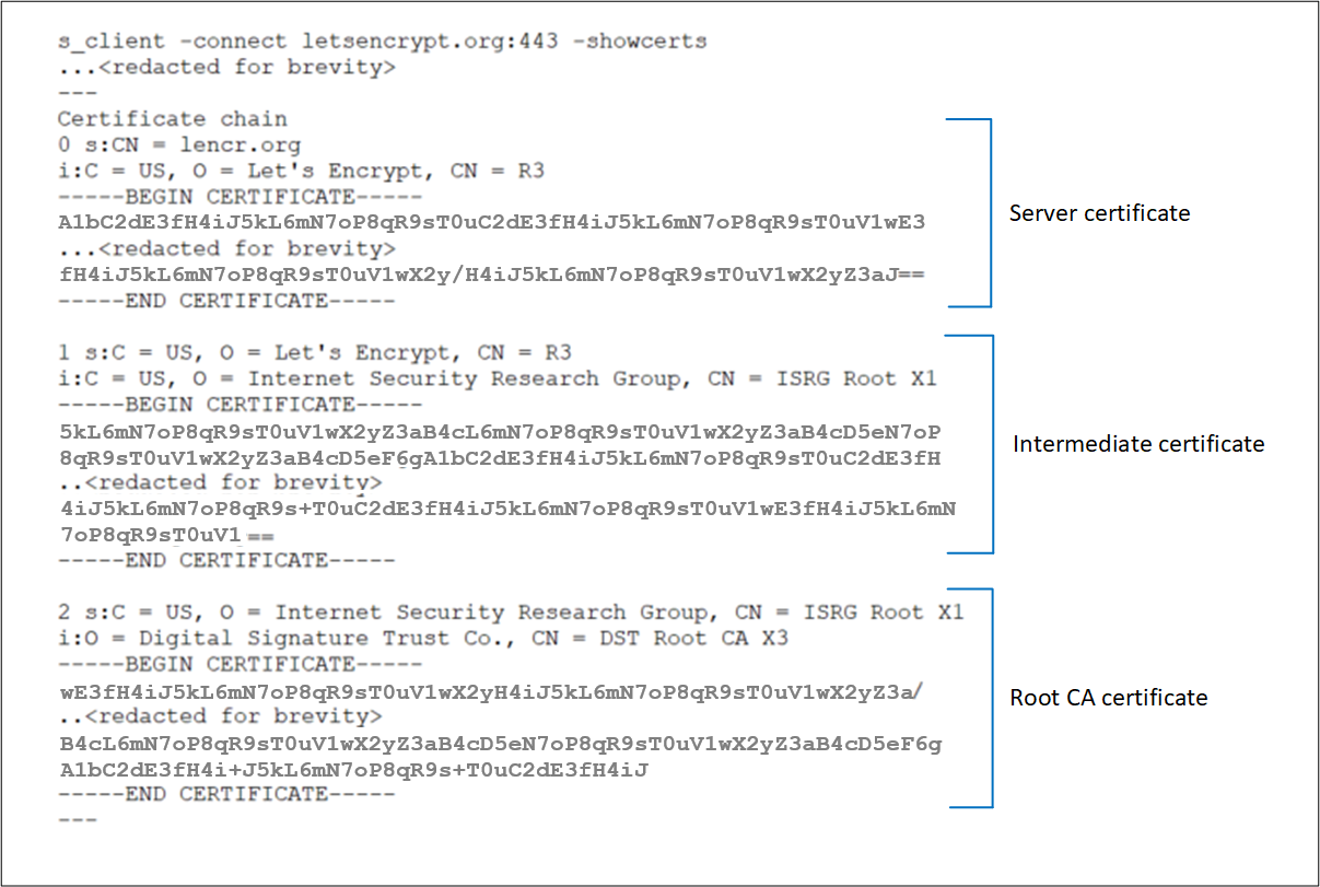Given is an example of a Server certificate installation along with its Intermediate and Root CA certificates, denoted as depths (0, 1, 2, and so on) in OpenSSL. You can verify the same for your backend server’s certificate using the following OpenSSL commands.