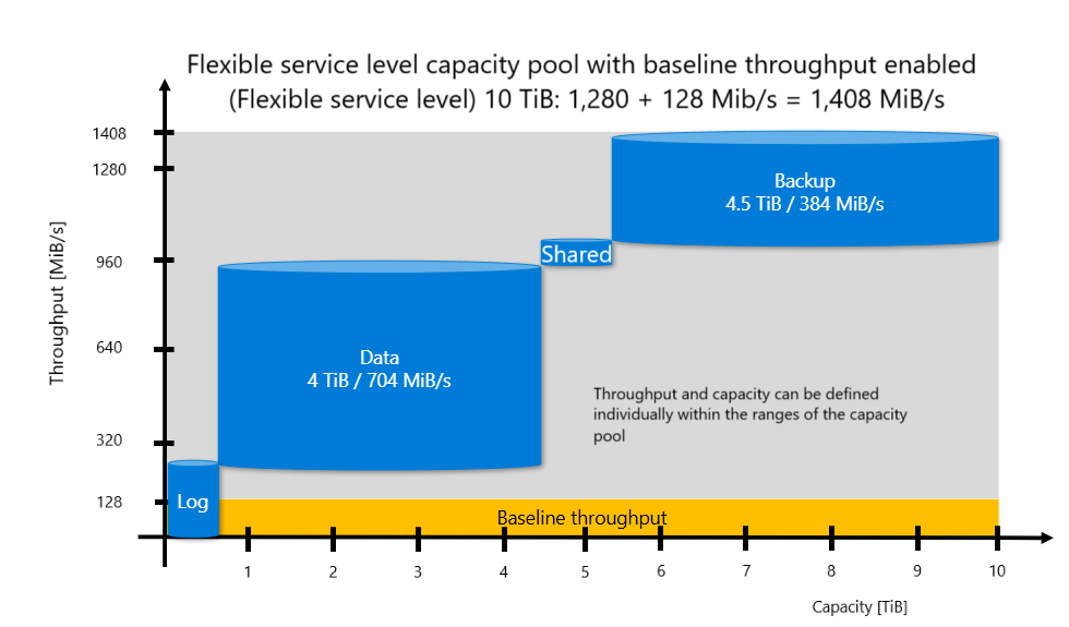 The minimum throughput you can assign a Flexible capacity pool is 128 MiB/second regardless of the pool quota. The maximum throughput is 5 x 128 MiB/second/TiB x the size of the capacity pool in TiB. For more information, see Flexible service level throughput examples and considerations for the Flexible service level.