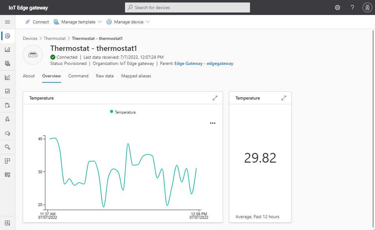 To see the telemetry in IoT Central, navigate to the Overview page for the thermostat1 device: