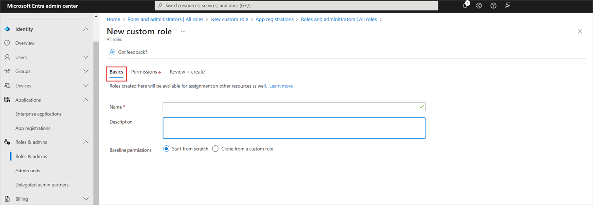 On the Basics tab, provide a name and description for the role.