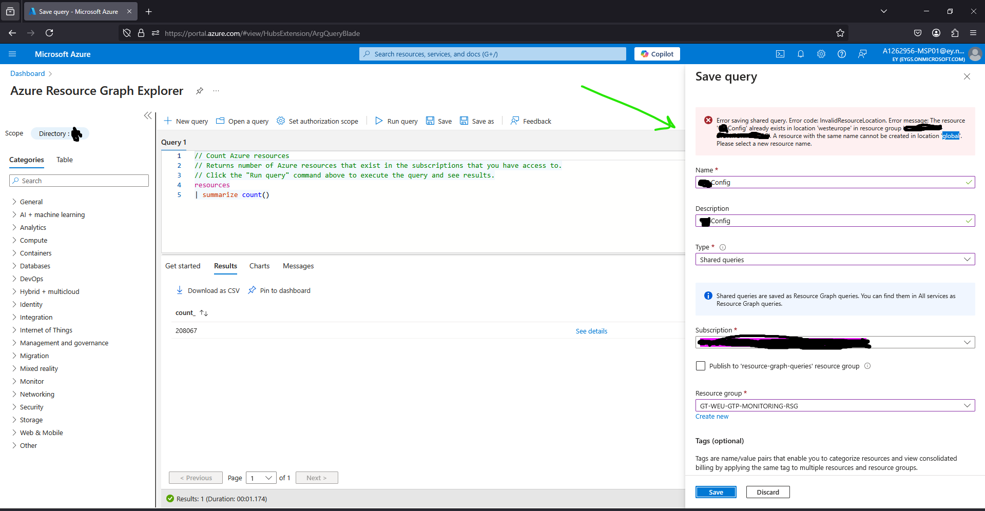 Get-AzResourceGraphQuery -ResourceGroupName "xyz" -Name Config Get-AzResourceGraphQuery : No registered resource provider found for location 'westeurope' and API version '2018-09-01-preview' for type 'queries'. The supported api-versions are '2018-09-01-preview, 2024-04-01'. The supported locations are 'global'. At line:1 char:1 + Get-AzResourceGraphQuery -ResourceGroupName "xyz ... + ~~~~~~~~~~~~~~~~~~~~~~~~~~~~~~~~~~~~~~~~~~~~~~~~~~~~~~~~~~~~~~~~~~~~~ + CategoryInfo : InvalidOperation: ({ SubscriptionI...e = Config }:<>f__AnonymousType03) [Get-AzResourceGraphQuery_Get], RestException1 + FullyQualifiedErrorId : NoRegisteredProviderFound,Microsoft.Azure.PowerShell.Cmdlets.ResourceGraph.Cmdlets.GetAzResourceGraphQuery_Get