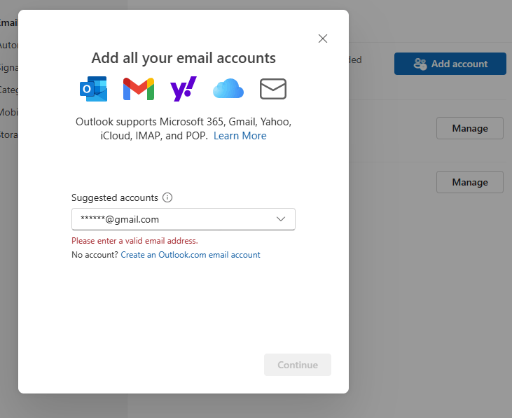 - In the Email Accounts window, select Add Account. In the Suggested Accounts drop-down menu, add the Gmail account you want to add and select Continue.