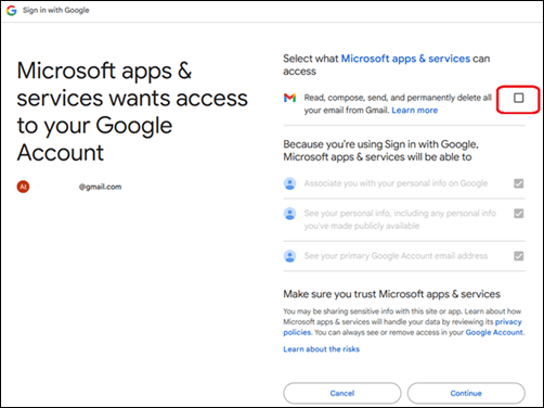 - At the ‘Synchronise your Gmail account’ prompt, select ‘Continue’. A new tab opens in your web browser asking you to sign in with your Google account.