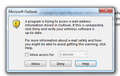 Check the Programmatic Access settings under the Trust Center in Outlook.
