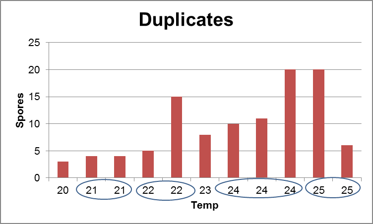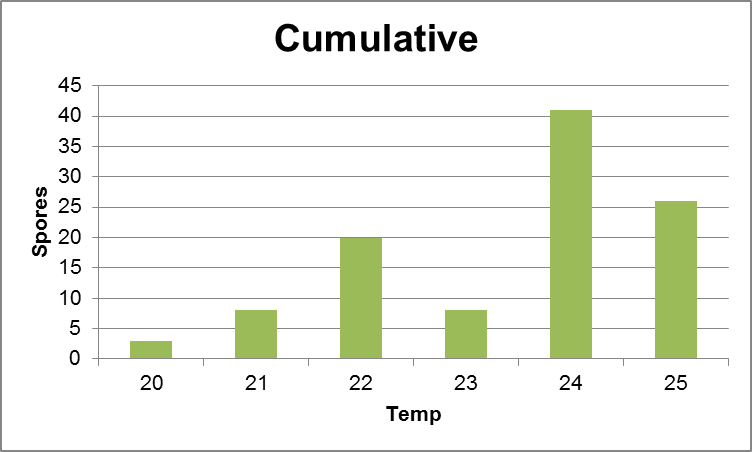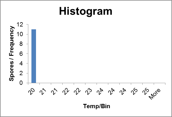 Data Histogram Data Temp Spores Bin Frequency 20 3 20 11 21 4 21 0 21 4 21 0 22 5 22 0 22 15 22 0 23 8 23 0 24 10 24 0 24 11 24 0 24 20 24 0 25 20 25 0 25 6 25 0 More 0