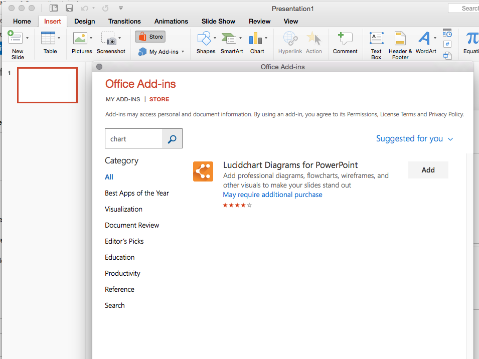 Assuming your installation of Office 2016 is fully updated, go to the Insert tab & click the Store button, then search using the term chart. This is what should be found: