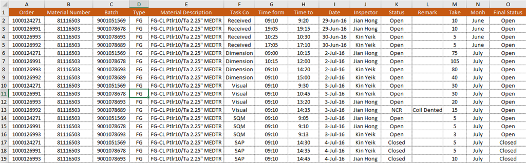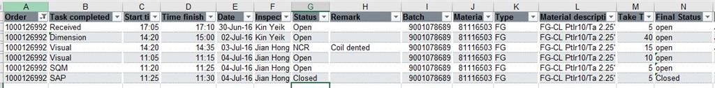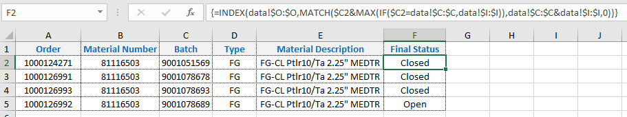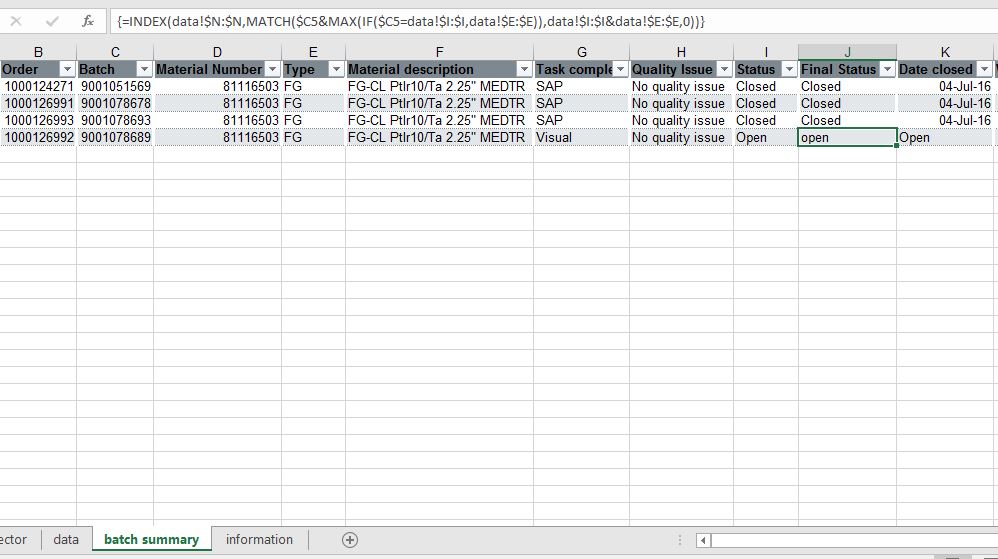 I have a pivot table which contain products going through a process (data tab). I wish to create a summaried table (batch summary tab) to show the final status showing 'open' or 'closed' (in column F) which can be retrieved from 'data tab' (in column O) . which formula show I used for this?