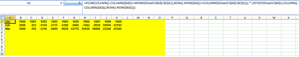 =IF(OR(COLUMN()-COLUMN($A$1)>=ROWS(Sheet1!$A$1:$C$11),ROW()-ROW($A$1)>=COLUMNS(Sheet1!$A$1:$C$11)),"",OFFSET(Sheet1!$A$1,COLUMN()-COLUMN($A$1),ROW()-ROW($A$1)))