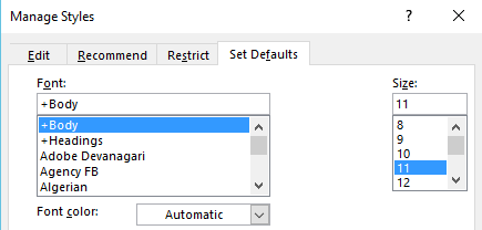 To change the document defaults, do the following: In the Styles pane (Ctrl+Alt+Shift+S), click the Manage Styles icon. On the Set Defaults tab, change the default font size to whatever size is defined for your Normal style. Click OK. (Alternatively, you can of course change the font size of the Normal style so that it matches whatever is the current default font size.)