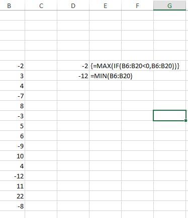 I searched online and found this suggested formula, =MAX(IF(B5:B30<0,B5:B30)), but it does not work for me. I keep getting #VALUE!