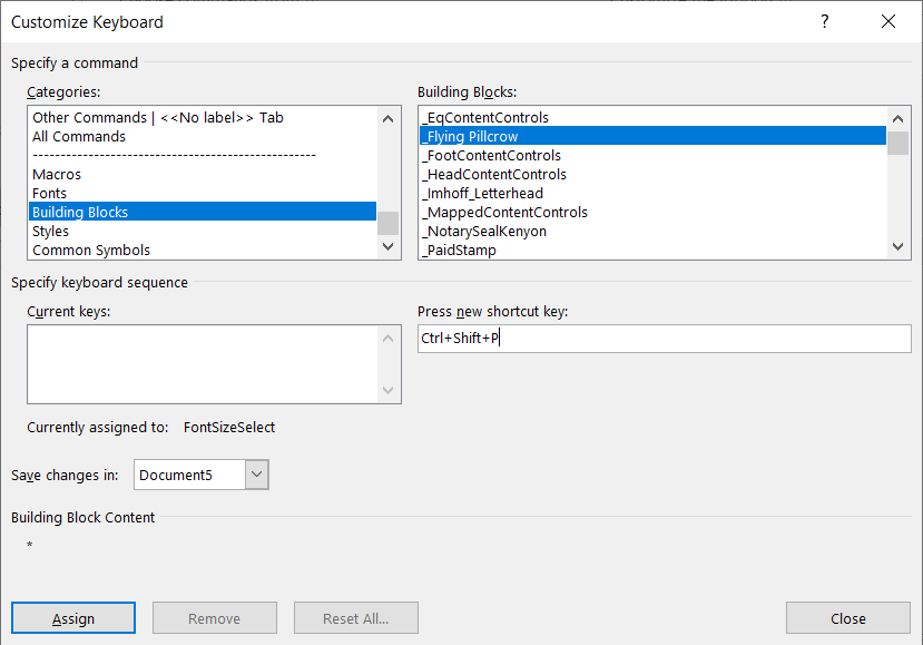 You can also create a keyboard shortcut for one and can use the F3 key together with the name to insert one, just as with other building blocks.