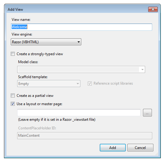 Now we need a WelcomeView template! Run the application so the new code is compiled. Close the browser, right-click inside the Welcome method, and then click Add View.