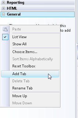 2. Right-click the Toolbox beneath the General Tab and select the menu option Add Tab (see Figure 4).