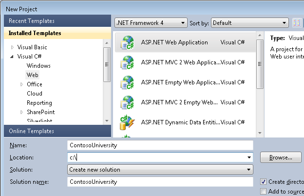 Shown in the tutorial Also works with Windows 7 Windows 8 Visual Studio 2010 Visual Studio 2010 Express for Web. The tutorial has not been tested with later versions of Visual Studio. There are many differences in menu selections, dialog boxes, and templates. .NET 4 .NET 4.5 is backward compatible with .NET 4, but the tutorial has not been tested with .NET 4.5. Entity Framework 4 The tutorial has not been tested with later versions of Entity Framework. Starting with Entity Framework 5, EF uses by default the DbContext APIthat was introduced with EF 4.1. The EntityDataSource control was designed to use theObjectContextAPI. For information about how to use the EntityDataSource control with theDbContextAPI, see this blog post.Questions
