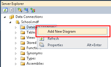 In Server Explorer, expand Data Connections, expand School.mdf, right-click Database Diagrams, and select Add New Diagram.