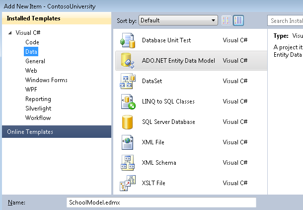 Right-click the DAL folder and then select Add and New Item. Under Installed Templates, select Data, select the ADO.NET Entity Data Model template, name it SchoolModel.edmx, and then click Add.
