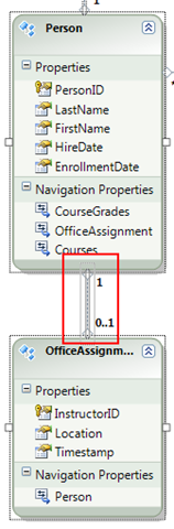 Personentity may or may not be associated with anOfficeAssignmententity. AnOfficeAssignmententity must be associated with aPersonentity. In other words, an instructor may or may not be assigned to an office, and any office can be assigned to only one instructor.A one-to-many association is represented by "1" and "*".