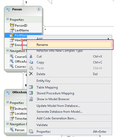 In the designer, right-click FirstName in the Person entity, and then select Rename.