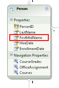 For purposes of this tutorial, suppose the FirstName column of the Person table actually contains both a person's first name and middle name. You want to change the name of the field to reflect this, but the database administrator (DBA) might not want to change the database. You can change the name of the FirstName property in the data model, while leaving its database equivalent unchanged.