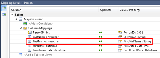 This opens the Mapping Details window. Notice that this window lets you see that the database column FirstName is mapped to FirstMidName, which is what you renamed it to in the data model.