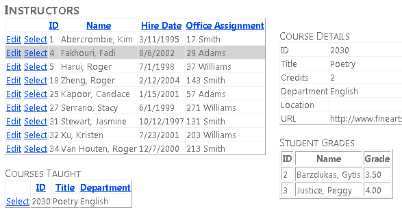 Users can view and update student, course, and instructor information. A few of the screens you'll create are shown below.
