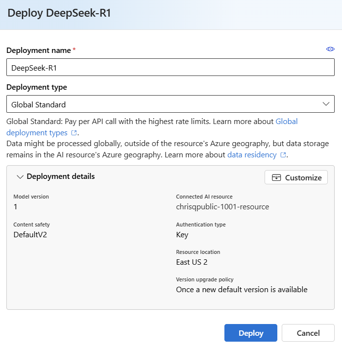 modelparameter for requests to route to this particular model deployment. This setup lets you configure specific names for your models when you attach specific configurations.Foundry automatically selects the Foundry resource you created earlier with your project. Use the Customize option to change the connection based on your needs. DeepSeek-R1 is currently available under the Global Standard deployment type, which provides higher throughput and performance.