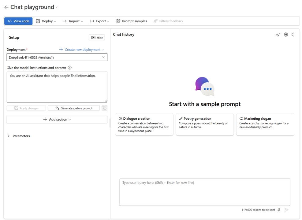 On the deployment details page, select Open in playground in the top bar. This action opens the chat playground.