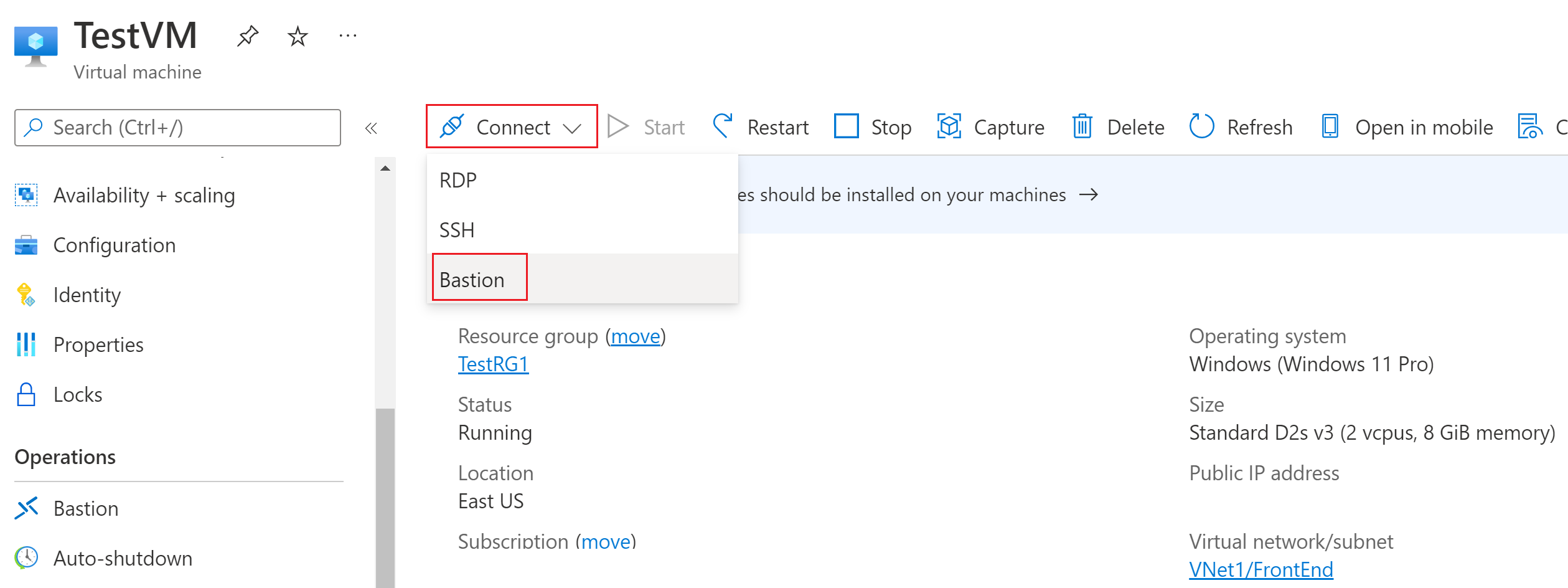 In the Azure portal, go to the virtual machine that you want to connect to. On the Overview page, select Connect, then select Bastion from the dropdown to open the Bastion page. You can also select Bastion from the left pane.