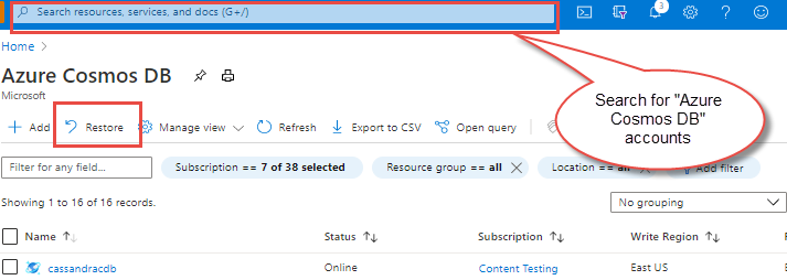 Search for Azure Cosmos DB resources in the global search bar. It lists all your existing accounts.