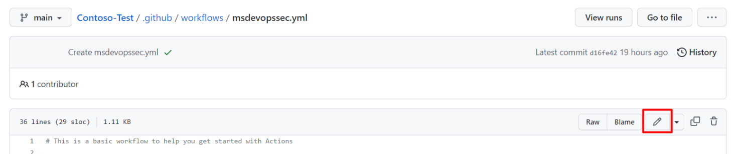 Your repository's home page> .github/workflows.Select msdevopssec.yml, which was created in the prerequisites.