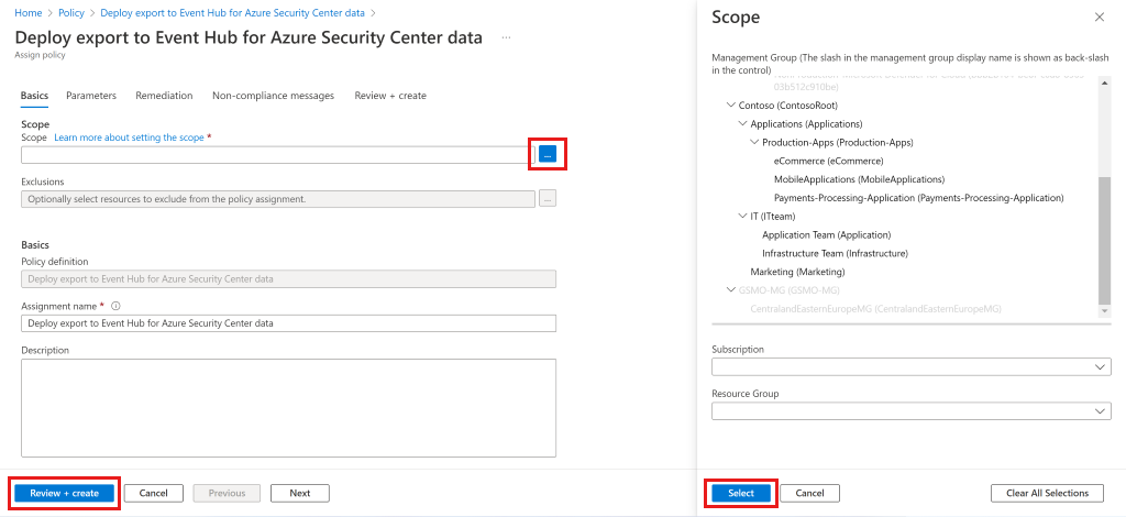 - Find the root management group (for tenant scope), management group, subscription, or resource group in the scope and select Select.