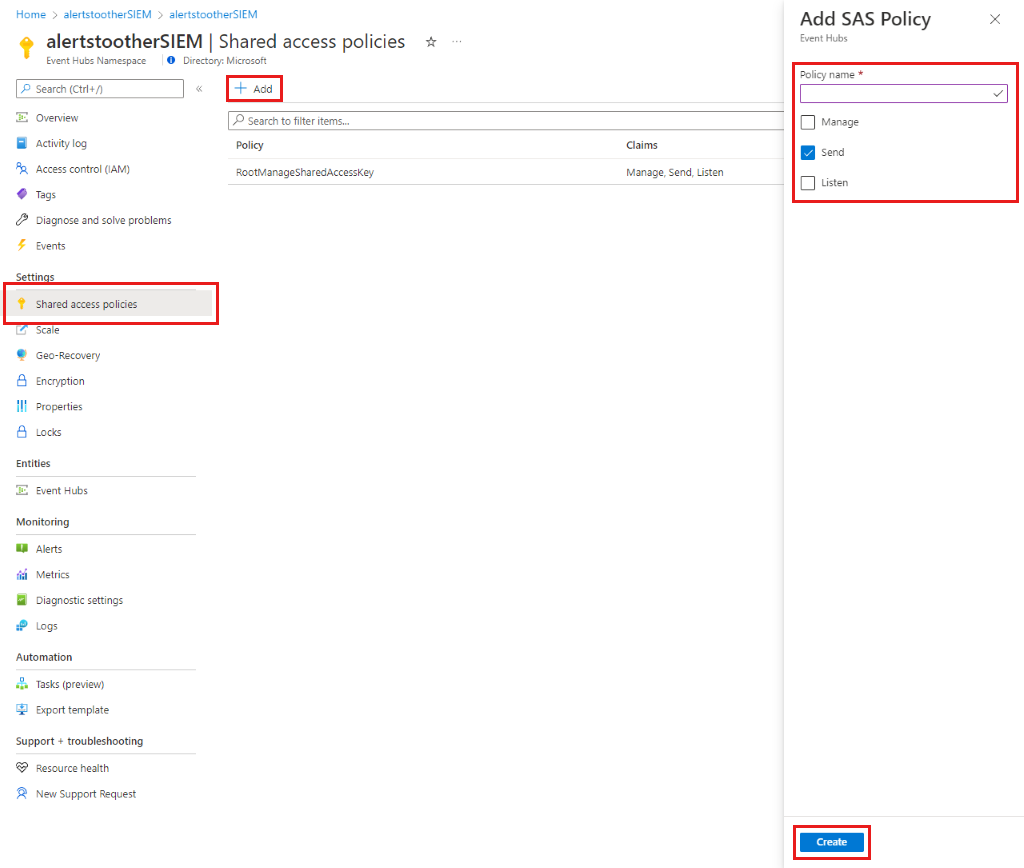 Select Review and Create and Create to finish the process of defining the continuous export to Event Hubs.