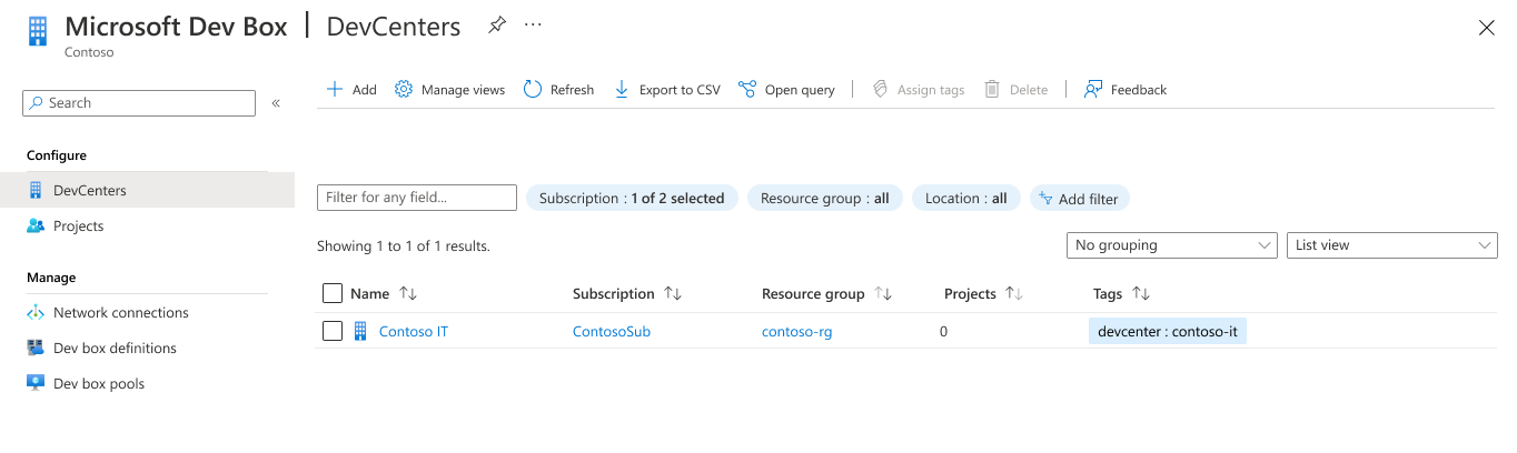 Screenshot that shows a list of existing dev centers.