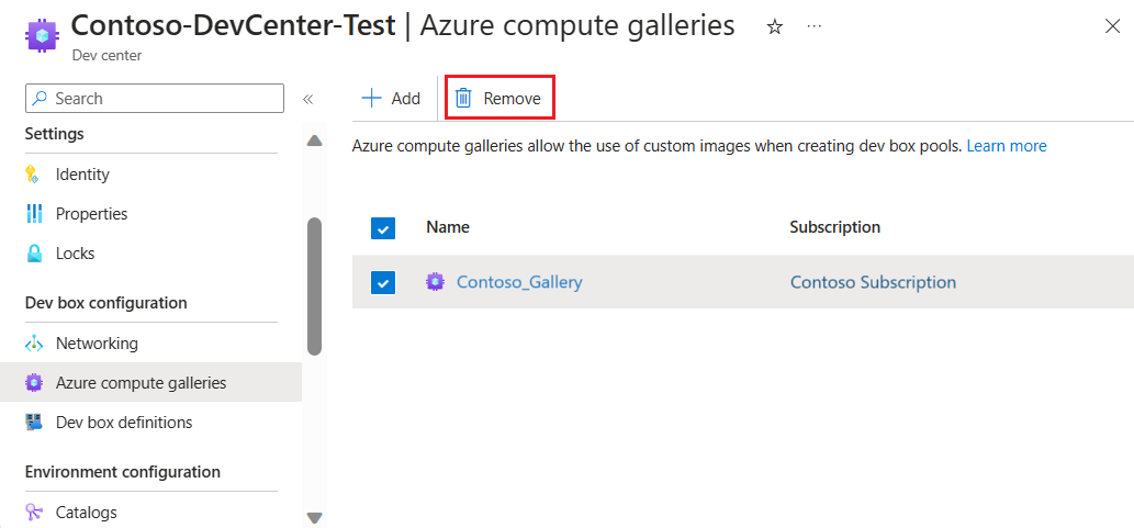 You can't remove galleries that are being actively used in dev box definitions. Before you can remove such a gallery, you must delete the associated dev box definition or update the definition to use an image from a different gallery.