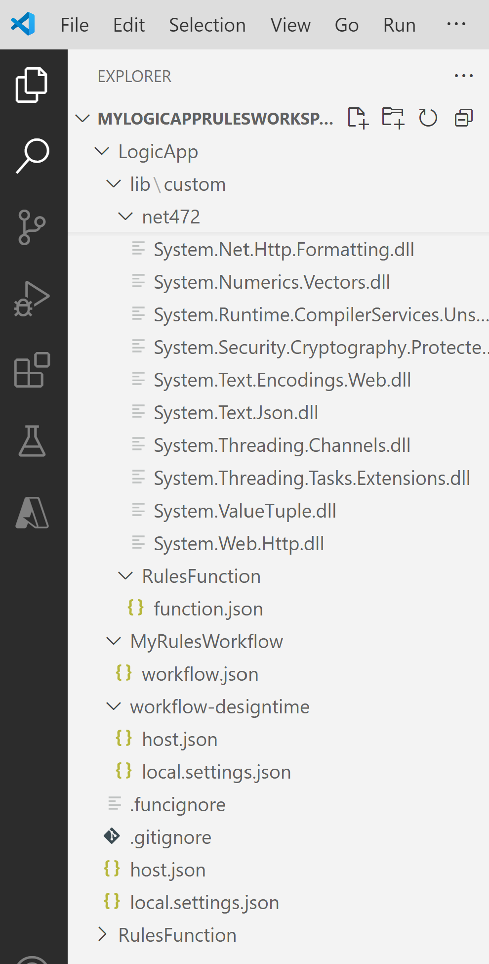 After you finish this step, Visual Studio Code creates your workspace, which includes a functions project and a logic app rules engine project, by default, for example: