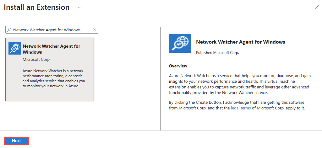3. In the search box of Install an Extension, enter Network Watcher Agent for Windows. Select the extension from the list and select Next.
