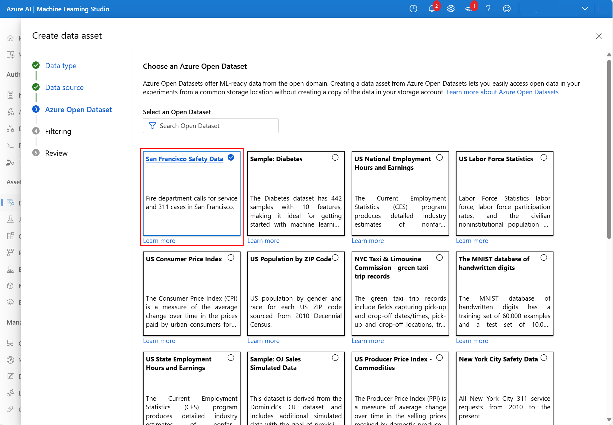 At the next screen, select an available Azure Open Dataset. In this screenshot, we selected the San Francisco Safety Data Dataset: