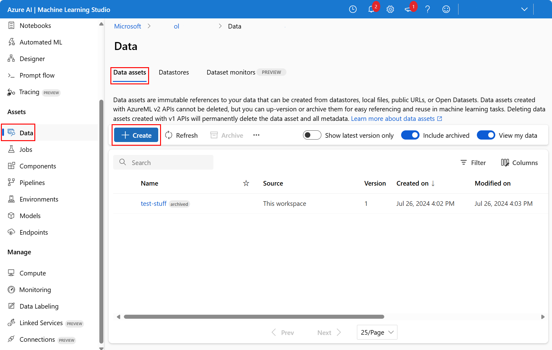 In your workspace, select the Data in the left nav. At the Data assets tab, select Create, as show in this screenshot: