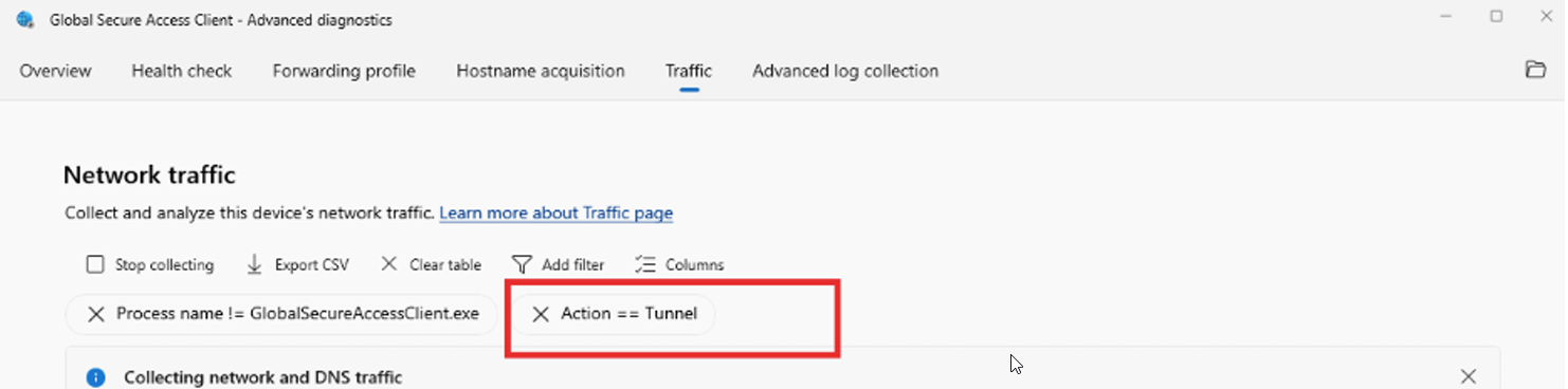 3. Ensure the default filter for Action == Tunnel is removed. A screenshot of the Global Secure Access Advanced Diagnostics page showing Network traffic details.