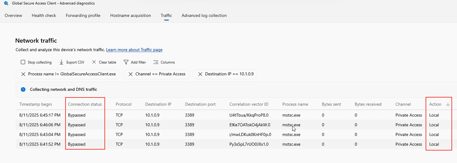 5. Verify that the Connection Status is Bypassed and that Action is Local in the Network Traffic. A screenshot of the Global Secure Access Advanced Diagnostics page showing Network traffic status and settings.
