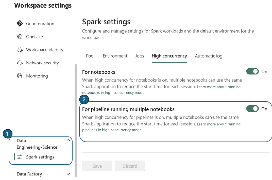 Navigate to the Data Engineering/Science section > Spark settings > High concurrency.