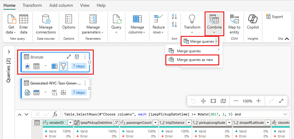 Select your original data query (In our example, its called Bronze), and on the Home tab, Select the Combine menu and choose Merge queries, then Merge queries as new.