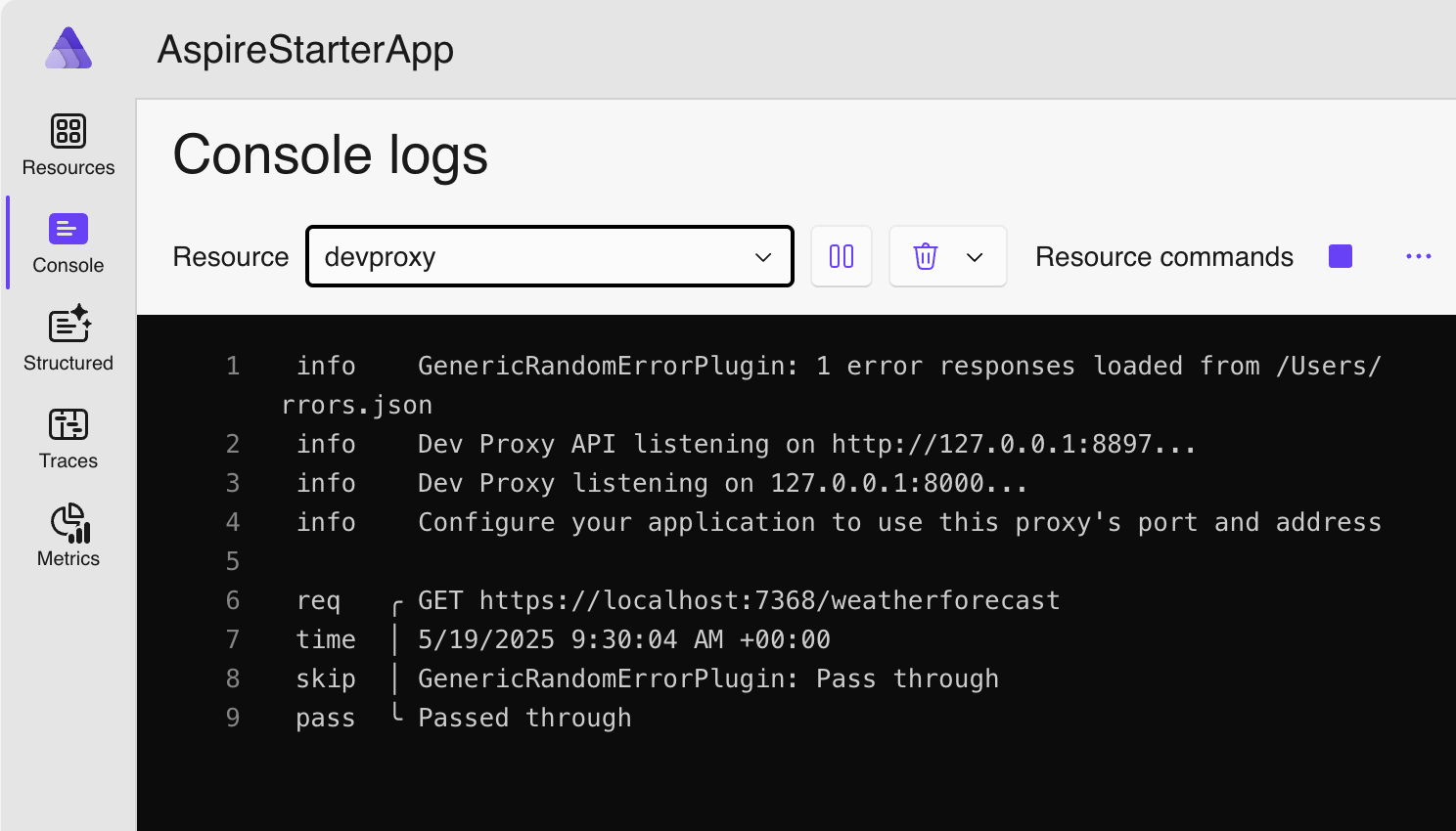 When you use the web application so that it makes requests to the API service, Dev Proxy intercepts the requests and handles according to your configuration. You can see the Dev Proxy output in the Console section of the .NET Aspire dashboard.