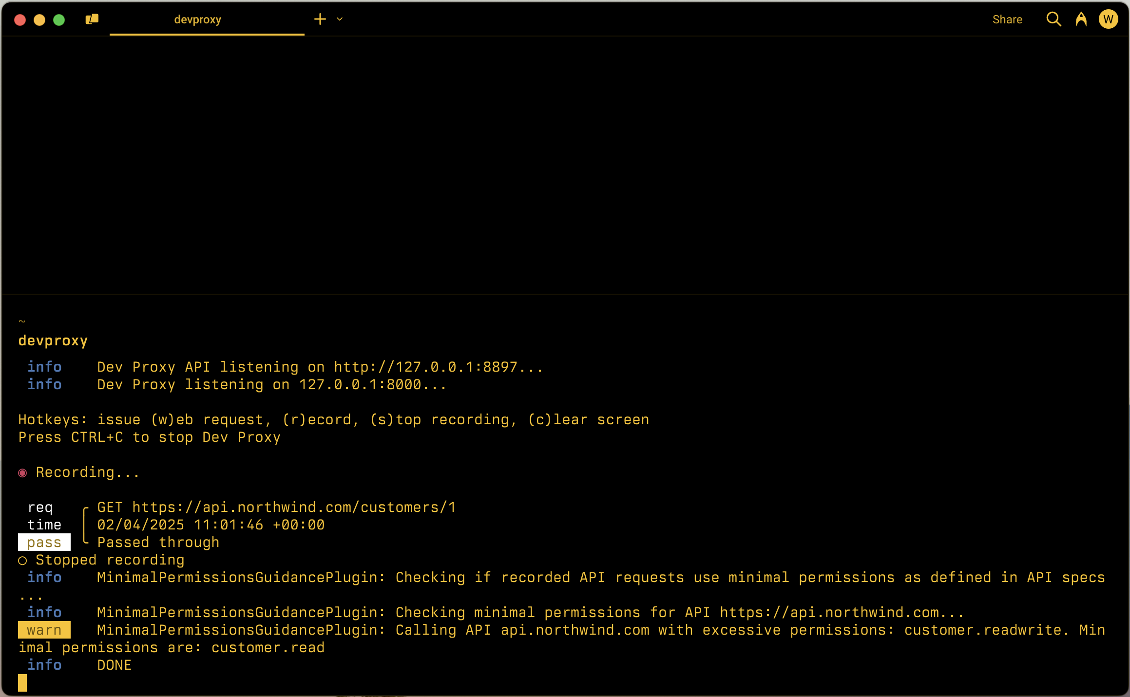 The MinimalPermissionsGuidancePlugin plugin supports checking OAuth permissions for APIs secured with OAuth. The plugin computes the minimal permissions required to call the APIs used in the app using the information from the provided API specifications. Then, the plugin compares the permissions used in the JSON Web Token (JWT) token against the minimum required scopes needed for the requests that Dev Proxy recorded.