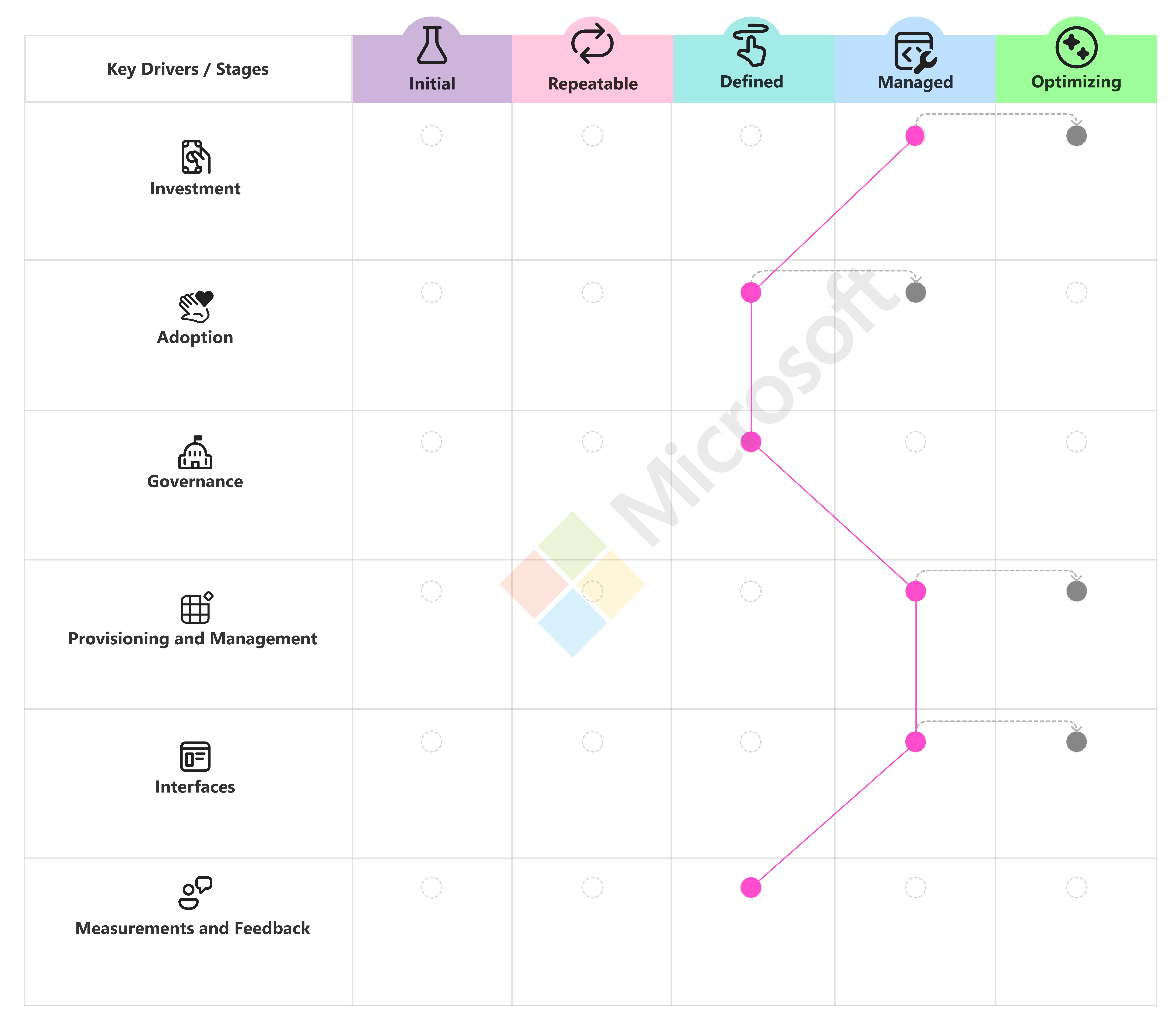 The software company plans to focus on grow for four key drivers: investment, adoption, provisioning and management, and interfaces. The software company already functions at a high platform engineering level and wants to continue. The company plans to explore ways to integrate generative AI (with governance), increase platform adoption, and implement metrics-driven feedback loops.
