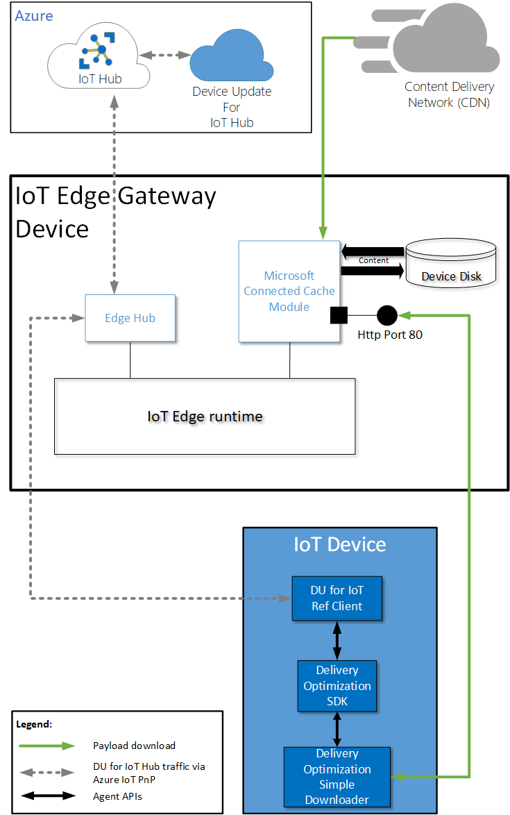 In a transparent gateway scenario, one or more devices can pass their messages through a single gateway device that maintains the connection to Azure IoT Hub. In these cases, the child devices may not have internet connectivity or may not be allowed to download content from the internet. The Microsoft Connected Cache preview IoT Edge module provides Device Update for IoT Hub customers with the capability of an intelligent in-network cache. The cache enables image-based and package-based updates of Linux OS-based devices behind an IoT Edge gateway (also called downstream IoT devices), and also helps reduce the bandwidth used for updates.