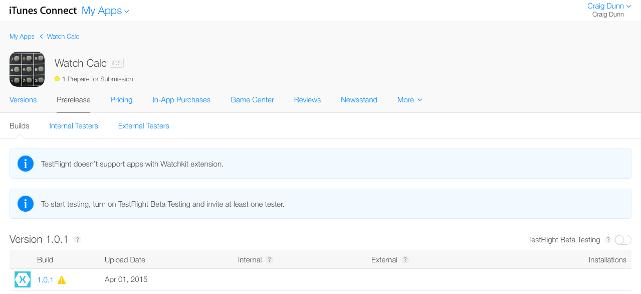 5. Visit iTunes Connect again to see the uploaded binary. Go to your app's configuration page and choose Prerelease from the top menu to see the Builds list: